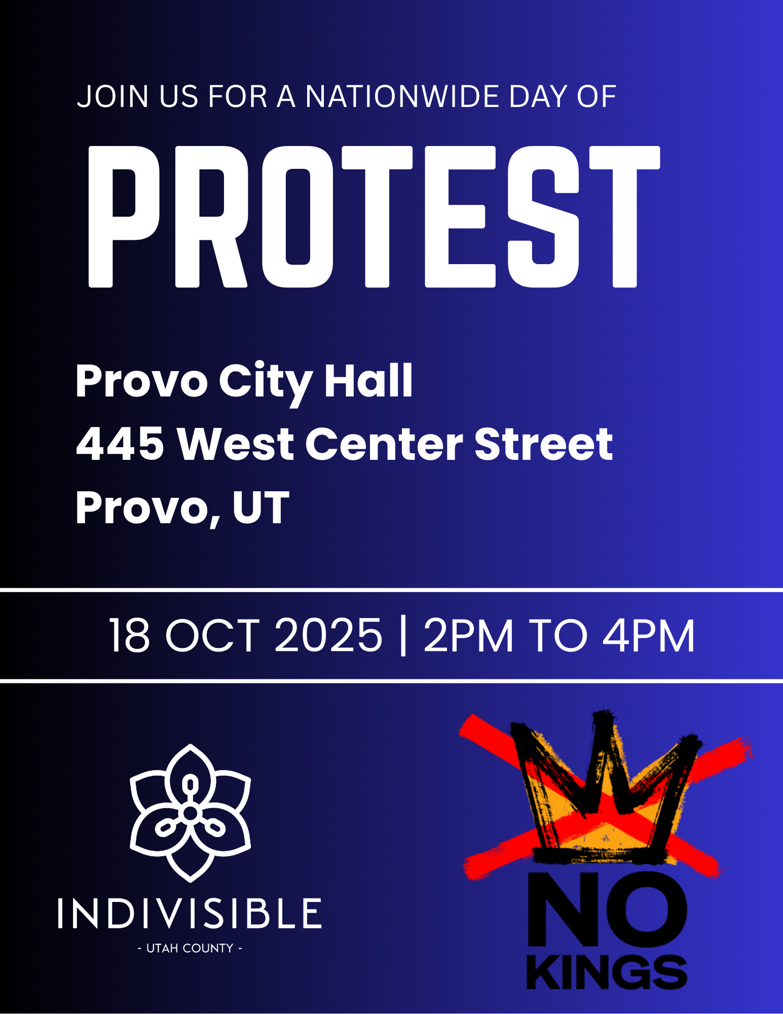 Join us in Utah County for our NO KINGS event . We are taking part in what is projected to be the largest day of protest in American history. Over 2,200 events like ours are being held in cities across the country. It is going to be AMAZING!